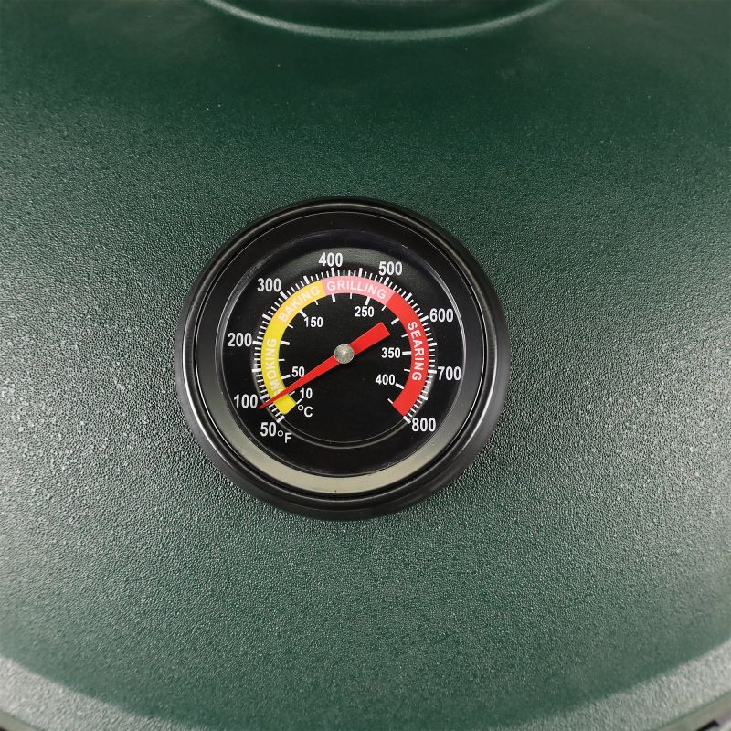 Grilio dangtelyje yra integruotas termometras, kuris leidžia stebėti temperatūrą kepimo metu.