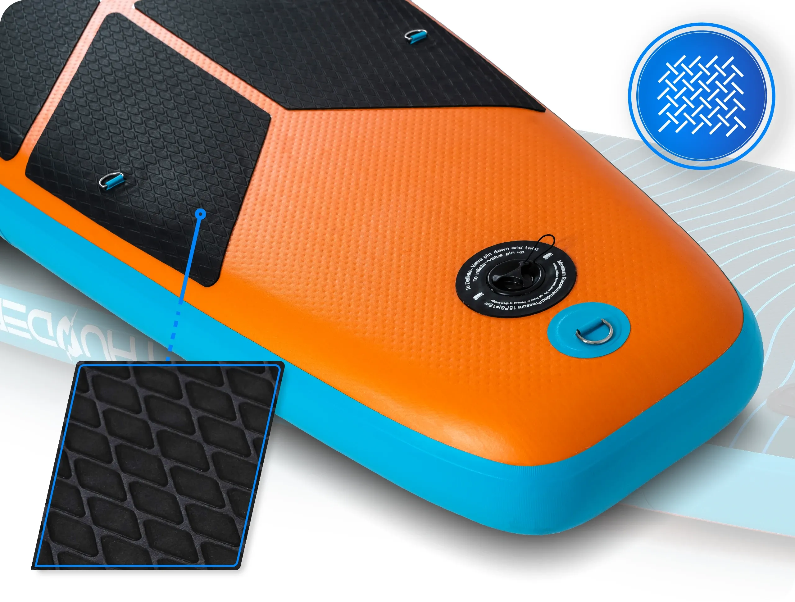 - Композитная оболочка UAL с толстым слоем ПВХ, армированного стекловолокном, покрыта 5-миллиметровым слоем пены EVA с мягкой, удобной и нескользящей текстурой, обеспечивающей исключительное сцепление и устойчивость.