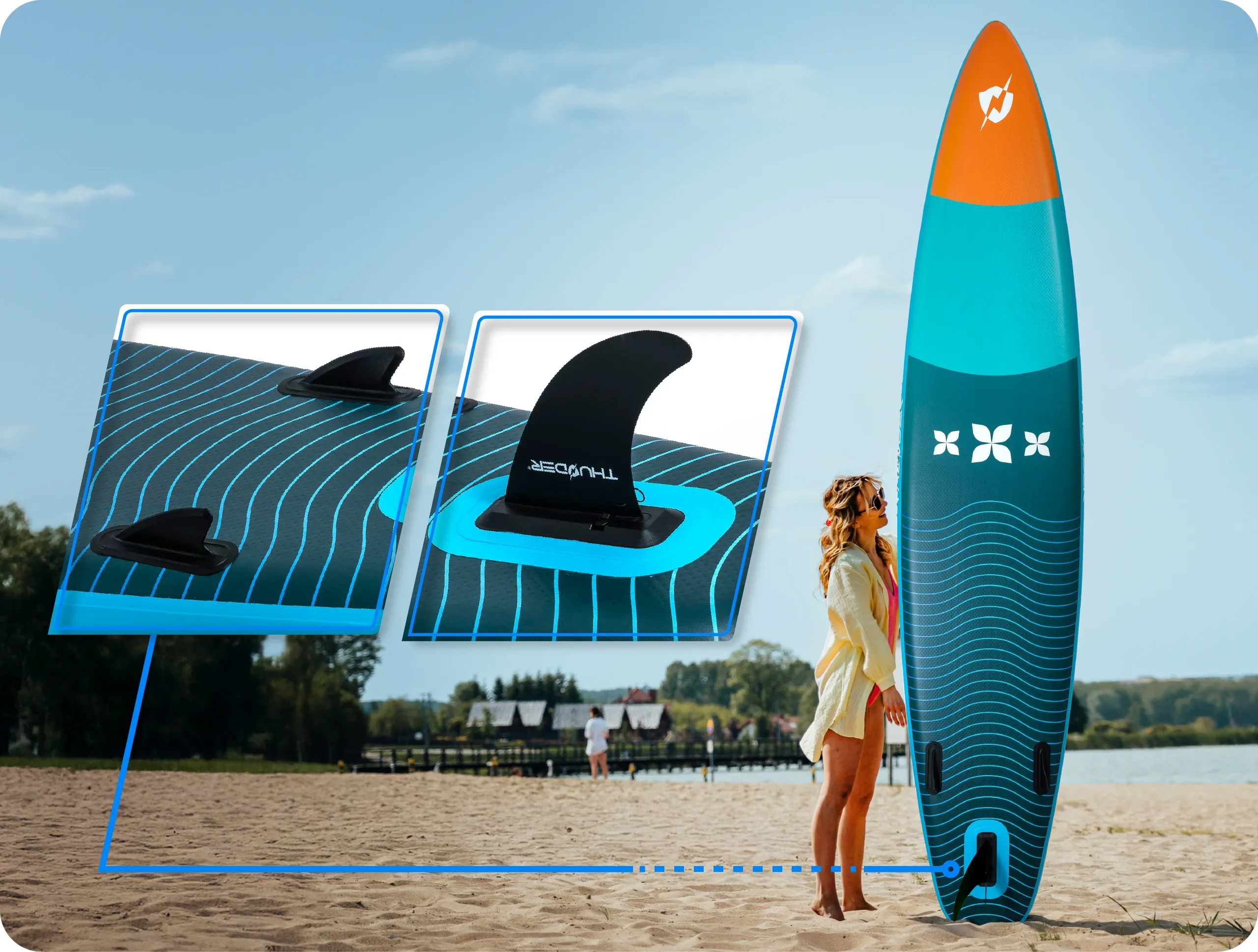 - Отличная маневренность благодаря трём плавникам в нижней части доски SUP эффективно улучшает скорость и управляемость, облегчая управление. Широкая доска облегчает сохранение равновесия . Идеально подходит для длительных многочасовых гребков на большие расстояния.