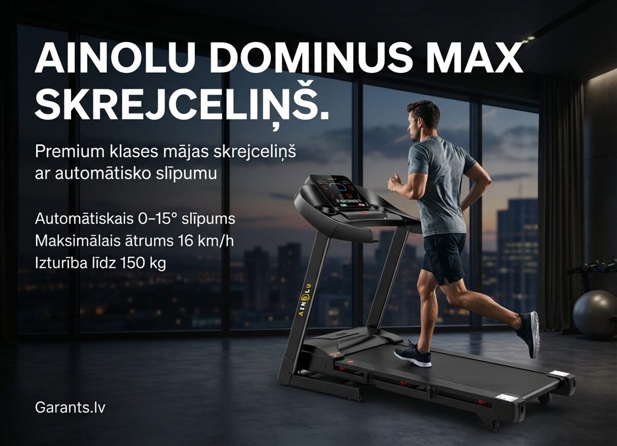 Premium klases mājas skrejceliņš ar automātisko slīpumuAINOLU – DOMINUS MAX ir mājas skrejceliņš, kas radīts cilvēkiem, kuri nevēlas kompromisus. Tas apvieno profesionālu jaudu, izcilu stabilitāti un modernu vadības sistēmu, radot pieredzi, kas ir līdzvērtīga sporta zāles aprīkojumam. Automātiskais slīpums, kluss motors, stabila konstrukcija un augstas kvalitātes amortizācija padara šo skrejceliņu par vienu no labākajiem risinājumiem intensīviem treniņiem mājās.